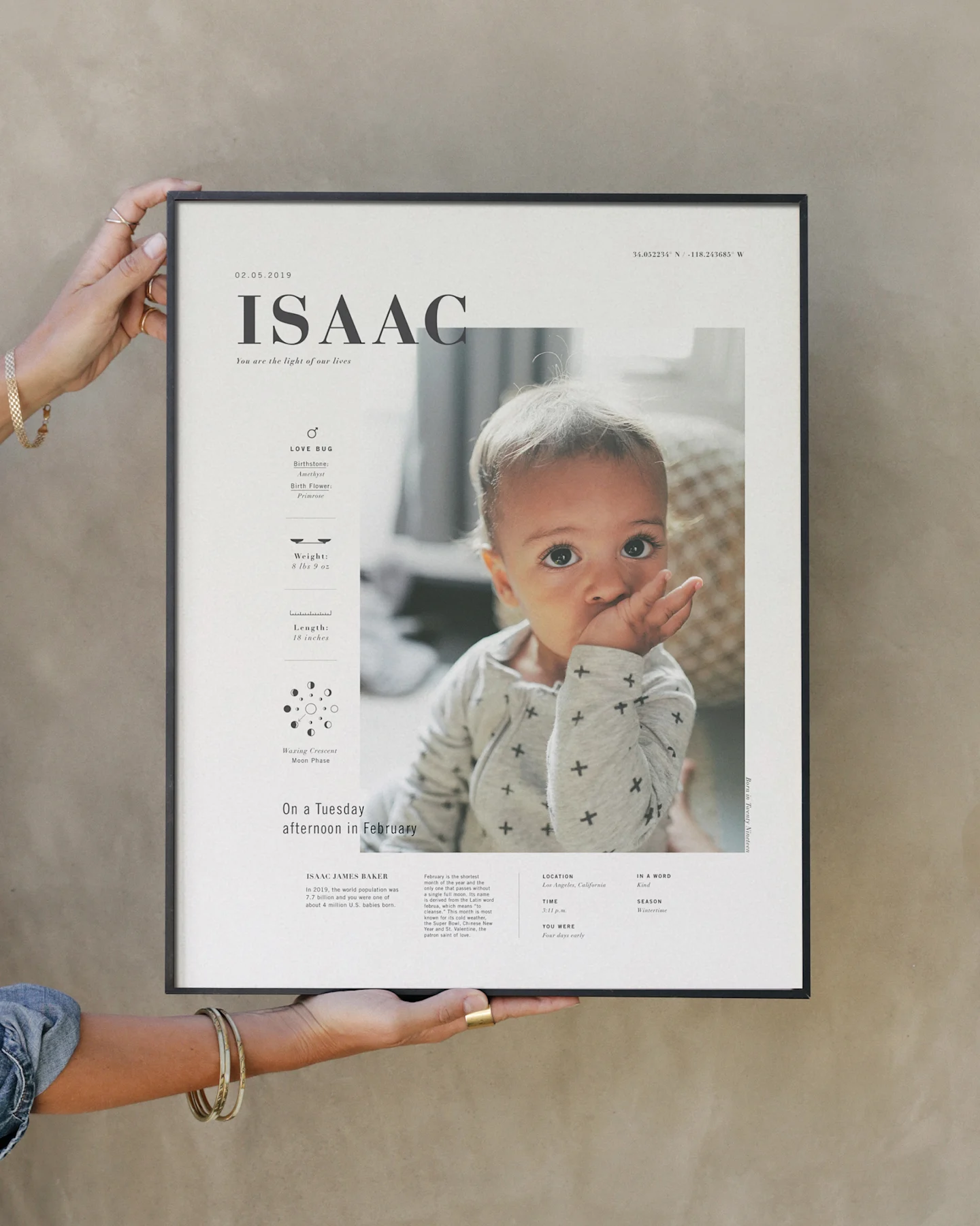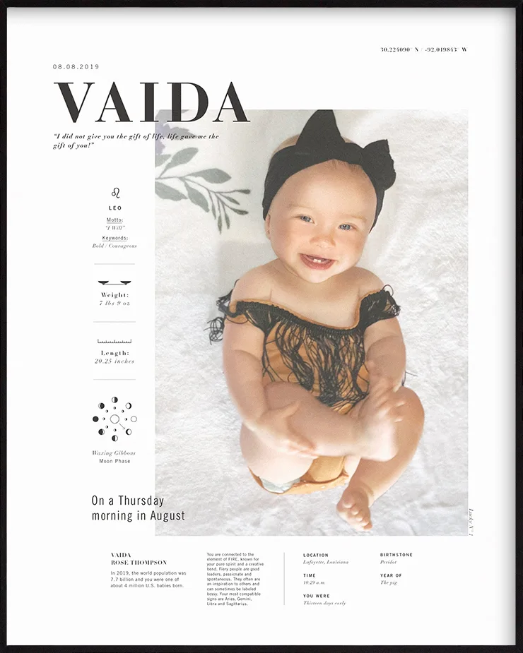 Our 16x20” Signature Birth Stat Print tells the story of your child and the day they were born. Each print includes birth statistics (height, weight, time, location), Moon Phase (the day born), option to include astrology, birthstone, birth flower and a customized sentence for your child.
